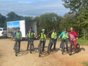 Nach dem Aufstieg auf die 109 Stufen des Cheisacherturms wurden wir mit einer atemberaubenden Aussicht belohnt – vom Schwarzwald bis zu den Berner Alpen. Anschliessend zogen wir Helm und Leuchtweste an und machten uns auf die Trotti-Abfahrt. Da es sich um eine abwechslungsreiche Tour handelte, mussten wir zwischendurch auch mal schieben, aber unser Guide nutzte diese Gelegenheiten stets, um uns spannende Informationen zur Umgebung zu vermitteln.